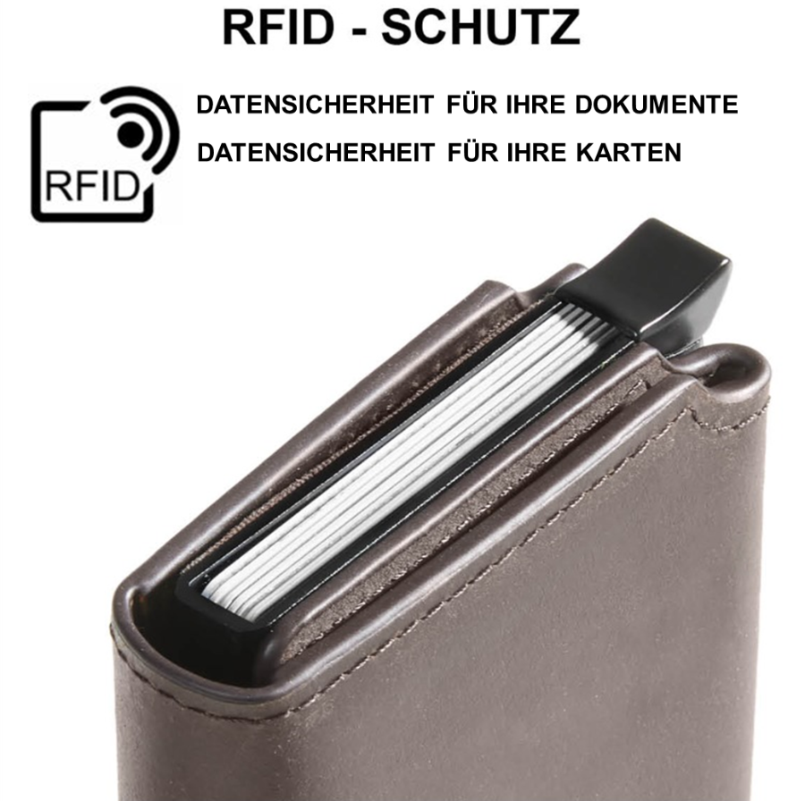 RFID Schutz für bis zu 8 Karten bedeutet, dass das Lederwallet mit einer speziellen Technologie ausgestattet ist, die verhindert, dass Daten von RFID-fähigen Karten (Radio Frequency Identification) unbefugt ausgelesen werden können. RFID-Karten, wie Kreditkarten, Ausweise oder Zugangskarten, enthalten einen kleinen Chip und eine Antenne, die Informationen drahtlos übertragen können. Ohne Schutz könnten diese Informationen von Kriminellen mit RFID-Lesegeräten abgefangen werden. Das Wallet blockiert diese Signale und schützt bis zu drei Karten gleichzeitig vor Datendiebstahl und unerlaubtem Zugriff. So bleiben Ihre persönlichen und finanziellen Informationen sicher.