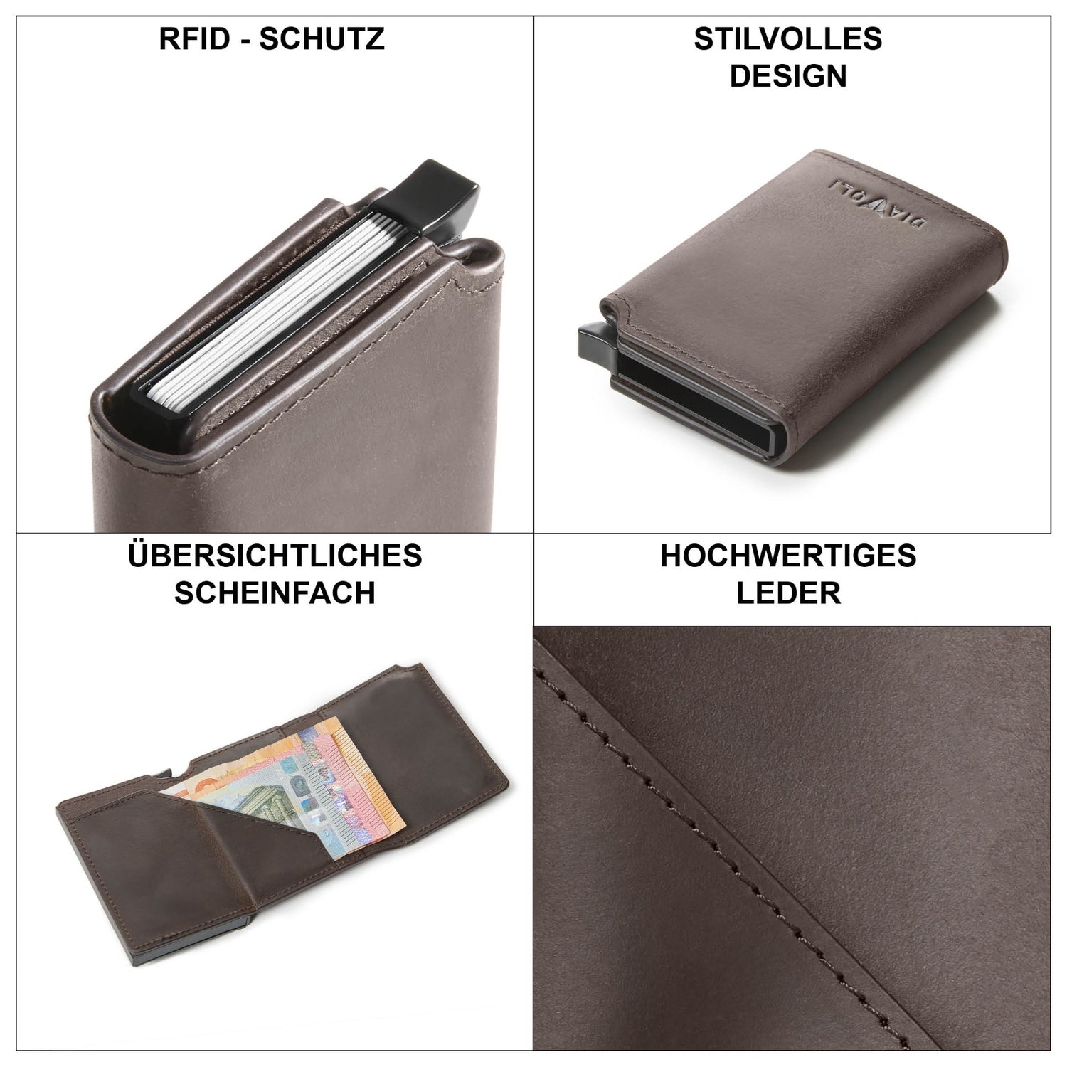 - Eingearbeiteter RFID-Schutz RFID-Schutz für bis zu 8 Karten